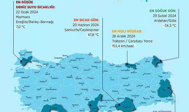 ÇEVRE, Şehircilik ve İklim Değişikliği Bakanlığı Meteoroloji Genel Müdürlüğü, geçen yıl en yüksek sıcaklığın 47,8 dereceyle Şanlıurfa'da, en düşük sıcaklığın eksi 34,3 dereceyle Ardahan'da ölçüldüğünü açıkladı.Meteoroloji Genel Müdürlüğü, ülke genelinde 2 bin 59 gözlem istasyonundan aldığı verilerle 2024 yılında Türkiye'de ölçülen rekor hava değerlerini açıkladı. Buna göre; yılın en sıcak günü 20 Haziran'da Şanlıurfa'nın Ceylanpınar ilçesinde 47,8 derece ile yaşandı. İl merkezlerinde ölçülen en yüksek sıcaklık değeri, 12 Haziran'da 44,6 derece ile Aydın'da ölçüldü. Yılın en soğuk günü 29 Şubat'ta eksi 34,3 derece ile Ardahan Göle'de yaşandı. İl merkezlerinde ölçülen en düşük sıcaklık değeri eksi 31,3 derece ile yine Ardahan'da kaydedildi. EN ÇOK YAĞMUR ANTALYA'YA DÜŞTÜGünlük en yüksek yağış, 13 Şubat'ta Antalya'nın Kepez ilçesinde metrekareye 297,7 kilogramla gerçekleşti. İl merkezlerinde kaydedilen en yüksek günlük toplam yağış yine 13 Şubat'ta metrekareye 233,9 kilogramla Antalya'da kaydedildi. En yüksek kar kalınlığı, Van'ın Bahçesaray ilçesi Karabet Tepesi'nde 6 Mart'ta 247 santimetre ile ölçüldü. İl merkezleri içindeyse en yüksek kar yüksekliği, 30 Ocak'ta 132 santimetre ile Bitlis'te kaydedildi.RÜZGAR EN HIZLI TRABZON'DA ESTİRüzgarın en hızlı estiği gün, Trabzon'da Çarşıbaşı Yoroz'da saatte 153,4 kilometre hızla 28 Aralık oldu. İl merkezlerinde en yüksek rüzgar ölçümü, 24 Kasım'da Konya'da 88,9 kilometre saat hız olarak kayıtlara geçti. 2024 yılında deniz suyu sıcaklıklarında ölçülen en yüksek sıcaklık, 15 Ağustos'ta Adana'nın Karataş Balıkçı Barınağı Ana Mendirek Feneri İstasyonu'nda 32,9 derece olarak kayıtlara geçti. En düşük deniz suyu sıcaklığı, 22 Ocak'ta Marmara Ereğlisi Balıkçı Barınağı Mendirek Feneri İstasyonu'nda 7 derece ile ölçüldü.
