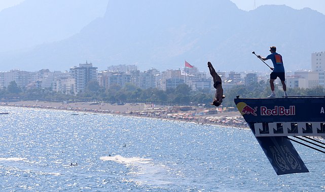 Adem AKALAN-İrem GÜNEYBAZ/ANTALYA, (DHA)- ANTALYA'da bir enerji içeceği firmasının düzenlediği 27 metre yükseklikten denize atlama etkinliği, heyecanla izlendi