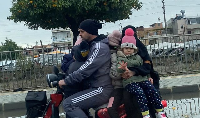 ADANA'da aynı aileden 6 kişinin bindiği motosiklette çocuklardan ikisi babanın kucağında, diğer ikisi ise annenin kucağında yolculuk yaptı. Ailenin tehlikeli yolculuğu cep telefonu kamerasıyla kaydedildi.Yüreğir ilçesi Ege Bagatur Bulvarı'nda 2 kişilik motosiklette anne, baba ve 4 çocukları, yolculuk yaptı. Tehlikeli yolculuk sırasında iki çocuğun motosikleti kullanan babasının kucağında, diğer iki çocuğun ise annesinin kucağında seyahat ederken, kimsenin kask takmadığı görüldü. Tehlikeli yolculuk, trafikteki bir kişi tarafından cep telefonuyla görüntülendi.
