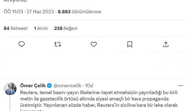 AK Parti Genel Başkan Yardımcısı ve Parti Sözcüsü Ömer Çelik, Cumhurbaşkanı Recep Tayyip Erdoğan'ın oğlu Bilal Erdoğan hakkındaki haberi nedeniyle Reuters haber ajansını kınadı.Çelik, sosyal medya hesabından yaptığı paylaşımda, Cumhurbaşkanı Erdoğan ve ailesine dönük saldırıların bir yenisine Reuters'ın imza attığını belirterek, "Masa başında hazırlanmış ve siyasi bir amaca dönük mesnetsiz iddialar ile dolu bu sözde haberi nedeniyle Reuters haber ajansını ve sorumsuz yönetimini şiddetle kınıyoruz" dedi.Yayımlanan haberin, Reuters'ın siciline kara bir leke olarak kazındığını dile getiren Çelik, "Reuters, temel basın-yayın ilkelerine riayet etmeksizin yayınladığı bu kirli metin ile gazetecilik örtüsü altında siyasi amaçlı bir kara propaganda üretmiştir. Medya ve algı operasyonlarıyla sözde habercilik yapmaya kalkışan odaklara gereken ders defalarca verilmiştir. Kara propaganda odakları bundan sonra da aynı sonuçla karşılaşmaya devam edeceklerdir" ifadelerini kullandı.