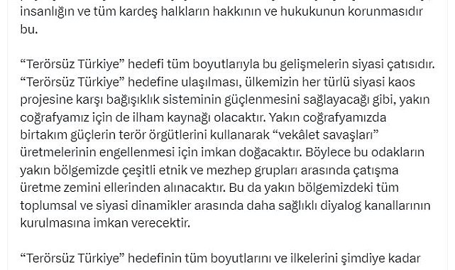 AK Parti Genel Başkan Yardımcısı ve Parti Sözcüsü Ömer Çelik, "Terörsüz Türkiye' hedefine ulaşılması, ülkemizin 'iç cephe'sinin güçlenmesine stratejik katkılar sağlayacaktır. Cumhuriyetimize ve demokratik siyasete güçlü bir 'siyasi enerji' verecektir. Özünde kaderdaşlık olan vatandaşlığımızı, Cumhuriyetimizin temel ilkeleri ekseninde tazeleyen imkanları üretecektir" dedi.AK Parti Sözcüsü Çelik, sosyal medya hesabından yaptığı açıklamada, "Sayın Cumhurbaşkanımızın ülkemizde 'iç cephe'nin güçlendirilmesi çağrısı, giderek istikrarsızlaşan dünyada ülkemizin değerlerinin ve kazanımlarının korunması ve ileriye taşınması iradesidir. Bunun yakın bölgemizdeki yansıması ise bölge halkları ve devletleri arasında 'kardeşlik cephesi'nin güncellenerek inşa edilmesidir. Emperyalist paylaşım savaşları ile 'dünyayı cehenneme çevirmeye çalışanlar'a karşı, insanlığın ve tüm kardeş halkların hakkının ve hukukunun korunmasıdır bu. 'Terörsüz Türkiye' hedefi tüm boyutlarıyla bu gelişmelerin siyasi çatısıdır. 'Terörsüz Türkiye' hedefine ulaşılması, ülkemizin her türlü siyasi kaos projesine karşı bağışıklık sisteminin güçlenmesini sağlayacağı gibi, yakın coğrafyamız için de ilham kaynağı olacaktır. Yakın coğrafyamızda birtakım güçlerin terör örgütlerini kullanarak 'vekalet savaşları' üretmelerinin engellenmesi için imkan doğacaktır. Böylece bu odakların yakın bölgemizde çeşitli etnik ve mezhep grupları arasında çatışma üretme zemini ellerinden alınacaktır. Bu da yakın bölgemizdeki tüm toplumsal ve siyasi dinamikler arasında daha sağlıklı diyalog kanallarının kurulmasına imkan verecektir" değerlendirmesinde bulundu.'SİYASİ ENERJİ VERECEK''Terörsüz Türkiye' hedefinin tüm boyutlarını ve ilkelerini şimdiye kadar en net cümlelerle defalarca açıkladıklarını hatırlatan Çelik, "Buna rağmen bazı çevrelerin karalama kampanyasının devam ettiğini görüyoruz. Hedefe ulaşılmasını engellemek için siyasi sis bombaları atanların ve provokasyon üretenlerin farkındayız. Bu kampanyaları yürütenlerin yakın bölgemizdeki gelişmeleri doğru okuyamadığı, hatta temel gerçekler konusunda doğru bilgi sahibi olmadığı görülmektedir. Bu yaklaşımlara sahip olanların yakın bölgemizin ve dünyanın içinden geçtiği şartları yönlendirmeye dönük bir siyasi çerçevesi ve siyasi pusulası da yoktur. 'Terörsüz Türkiye' hedefine ulaşılması, ülkemizin 'iç cephe'sinin güçlenmesine stratejik katkılar sağlayacaktır. Cumhuriyetimize ve demokratik siyasete güçlü bir 'siyasi enerji' verecektir. Özünde kaderdaşlık olan vatandaşlığımızı, Cumhuriyetimizin temel ilkeleri ekseninde tazeleyen imkanları üretecektir. 'Terörsüz Türkiye' hedefine şimdiye kadar defalarca altını çizdiğimiz ilkeler çerçevesinde ulaşılmasıyla beraber, çivisi çıkan dünyaya karşı bölgemizde 'kardeşlik cephesi'nin yeni bir güçle inşa edilmesiyle cevap verme imkanı doğacaktır" ifadelerini kullandı.'HER OLUMLU ADIM, BİR SONRAKİ OLUMLU ADIMI ÇAĞIRACAK'AK Parti Sözcüsü Çelik, açıklamasının devamında ise şunları kaydetti:"İmralı'dan yapılan PKK'nın kendini feshetmesi ve silah bırakması gerektiğine dair çağrı, terörün tüm illegal ve silahlı unsurlarıyla bitmesine ve terör örgütünün dış odakların 'vekalet savaşları'nın parçası olmaktan çıkmasına dönük bir aşamaya geçmelidir. Terör örgütünün silah bırakmasına ve kendini feshetmesine dönük olarak önümüzdeki günlerde gelişebilecek her olumlu adım, bir sonraki olumlu adımı çağıracaktır. Her aşamayı titizlikle takip ediyoruz. MHP Genel Başkanı Sayın Devlet Bahçeli'nin tarihi ve stratejik çağrısı ile başlayan süreç, Sayın Cumhurbaşkanımızın yüksek iradesiyle 'devlet politikası' haline gelmiştir. Partiler arasındaki ziyaret trafiği sürecin siyasi oksijenini artırmış ve zeminini güçlendirmiştir. Cumhuriyetimizin sorunları çözme konusundaki demokratik kapasitesi yüksektir. Türkiye Cumhuriyeti, 'tek vatan, tek millet, tek devlet, tek bayrak' ilkesi esasında, millet şuuru ve devlet aklı ile gündemine hakimdir."