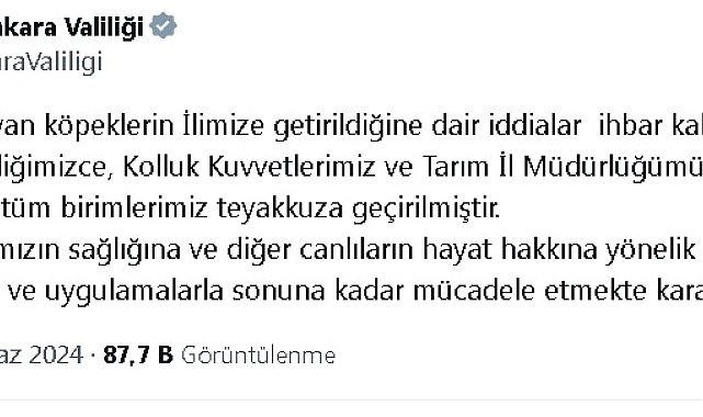 ANKARA Valiliği, hasta köpeklerin Ankara'ya getirildiği iddiası üzerine önlem almak için çalışma başlattı.Ankara Valiliği sosyal medya hesabından yaptığı paylaşımda, Hastalık taşıyan köpeklerin Ankara'ya getirildiğine dair iddiaları ihbar kabul ederek, kolluk kuvvetleri ve Tarım İl Müdürlüğü başta olmak üzere tüm birimleri ile çalışma başlattığını bildirdi. Valilikten yapılan açıklamada, "Vatandaşlarımızın sağlığına ve diğer canlıların hayat hakkına yönelik her türlü hareket ve uygulamalarla sonuna kadar mücadele etmekte kararlıyız" ifadelerini kullandı.