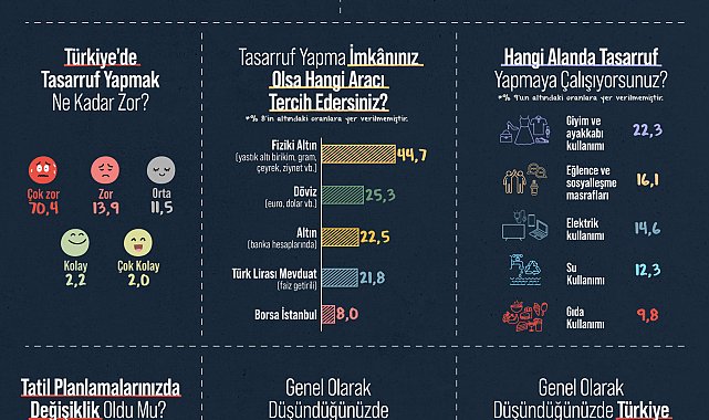 - Areda Piar araştırma şirketinin Türkiye genelinde bin 534 kişinin katılımıyla gerçekleştirdiği araştırmaya göre, Türk halkının yüzde 73,1'i para biriktiremiyor ve yüzde 70,4'üne göre Türkiye'de tasarruf yapmak çok zor. Para biriktiremediğini belirtenlerin yüzde 49,8'i tasarruf edecek gelirinin olmadığını söyledi. Tasarruf yapma imkânı olsa yüzde 44,7'si fiziki altın (yastık altı birikim, altın, ziynet) ile yatırım yapmayı tercih edeceğini belirtti. En çok giyim, ayakkabı, eğlence ve sosyalleşme masraflarından kısılıyor. Yüzde 50,7'si tatile artık gitmediğini ifade ederken yüzde 31,7'si ise tatil için artık daha uygun yerleri tercih ediyor. Katılımcıların yüzde 46,5'i kişisel mali durumunun kötü olduğunu ifade ederken yüzde 53,3'ü ise Türkiye'nin mevcut ekonomik durumuna kötümser bakıyor.Araştırmaya göre, Türk halkının yüzde 26,9'u para biriktirme hususunda bir sorun yaşamadığını ifade ederken yüzde 73,1'i para biriktiremiyor. Para biriktiremediğini ifade eden katılımcıların ise yüzde 49,8'i tasarruf edecek bir gelirinin olmadığını belirtti. Yüzde 23,3'ü aylık harcamasının yüksek olduğunu, yüzde 12,6'sı borçlarının olduğunu, yüzde 5,5'i beklenmedik masraflardan dolayı para biriktiremediğini belirtti. Ayrıca yüzde 5'i para biriktirme konusunda planlamaya sahip olmadığını, yüzde 1,4'ü alışveriş bağımlısı olduğunu ve yüzde 0,2'sinin birikim amacı olmadığı için para biriktiremediği anlaşıldı.EN ÇOK TERCİH EDİLEN TASARRUF ARACI: YASTIK ALTI BİRİKİM, DÖVİZ VE ALTINAraştırmada yer alan katılımcıların yüzde 70,4'ü Türkiye'de tasarruf yapmanın çok zor olduğunu ve yüzde 13,9'u zor olduğunu ifade etti. Yüzde 11,5'i orta düzeyde olduğunu belirtirken yüzde 2,2'si kolay ve yüzde 2'si çok kolay olduğunu söyledi.Katılımcılara, 'Tasarruf imkânınız olsa hangi aracı tercih edersiniz?' sorusu yöneltiliyor ve yüzde 47,7'si fiziki altın (yastık altı birikim, gram, çeyrek ziynet vs.) biriktirebileceğini belirtti. Yüzde 25,3'ü döviz (Euro, dolar vs.), yüzde 22,5'i altın, yüzde 21,8'i Türk lirası mevduat (Faiz geliri), yüzde 8'i Borsa İstanbul, yüzde 6,6'sı katılım hesapları (Faizsiz birikim hesapları), yüzde 4,5'i döviz mevduat (Faiz geliri), yüzde 3,7'si bireysel emeklilik hesapları, yüzde 1,8'i kripto para piyasasını tercih edeceğini dile getirdi.EN ÇOK GİYİM, AYAKKABI, EĞLENCE VE SOSYALLEŞME MASRAFLARINDAN KISILIYORAraştırmada katılımcılara en çok hangi alanlarda tasarruf yaptıkları da soruldu. Araştırmaya katılanların yüzde 22,3'ü giyim ve ayakkabıdan, yüzde 16,1'i eğlence ve sosyalleşme masraflarından kısarak tasarruf yaptığını belirtti. Yüzde 14,6'sı elektrik kullanımı, yüzde 12,3'ü su kullanımı, yüzde 9,8'i gıdadan ve yüzde 8,8'i her alanda tasarruf yaptığını söyledi. Ayrıca yüzde 3,8'i hediye ve bahşiş masraflarında, yüzde 2,8'i doğalgaz kullanımında, yüzde 2,3'ü kişisel bakım masraflarında, yüzde 1,8'i konut masraflarında ve yüzde 0,7'si sigorta masraflarında tasarrufa gidiyor.HALKIN YARISI TATİLE GİTMİYOR, GİDENLER DE BÜTÇEDE TASARRUFA GİDİYORPara biriktirmenin de tasarruf yapmanın da zor olduğu anlaşılan bu araştırmada katılımcılara tatil alışkanlıklarındaki değişkenlik de soruluyor. Katılımcıların yüzde 50,7'si artık tatile gitmediğini ifade etti. Bununla birlikte yüzde 31,7'si bütçesi daha uygun yerleri tercih ettiğini belirtirken yüzde 11,1'i tatil planlamasında herhangi bir değişim yaşamadığını söyledi. Tatil süresini daha kısa tutarak tasarruf ettiğini belirtenlerde toplumun yüzde 6,5'ini oluşturdu.Araştırmaya göre halkın yüzde 46,5'i kişisel mali durumunun kötü olduğunu ifade etti. Ne iyi ne kötü diyenlerin oranı ise yüzde 42,2. Kişisel mali durumu iyi olanların oranı yüzde 11,3 olarak belirlendi.Katılımcıların yüzde 53,3'üne göre Türkiye'nin mevcut ekonomik durumu, tıpkı kişisel mali durumu gibi kötü. Ne iyi ne kötü diyenlerin oranı yüzde 15,8 iken ülkenin ekonomisiyle ilgili iyimser olanların oranı yüzde 30,9 olarak araştırmaya yansıdı.ARAŞTIRMANIN METODOLOJİSİTürkiye genelinde bin 534 kişinin katıldığı 29 Nisan - 02 Mayıs tarihleri arasında yapılan araştırma, kantitatif araştırma yöntemlerinden CAWI tekniği ile 'Areda Piar'in Profil Bazlı Dijital Paneli' kullanılarak gerçekleştirildi.