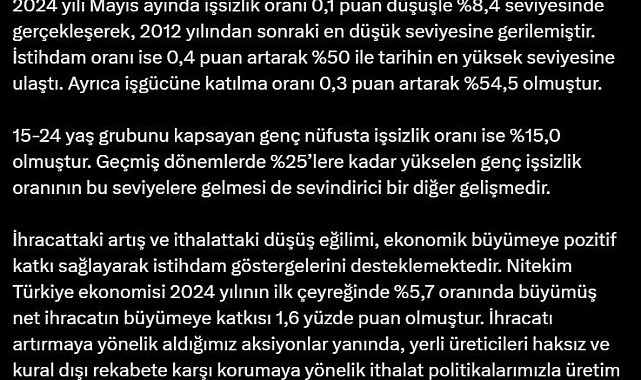 TİCARET Bakanı Ömer Bolat, mayısta 0,1 puan düşüşle yüzde 8,4 seviyesinde gerçekleşen işsizlik oranının, 2012 yılından sonraki en düşük seviyesine gerilediğini açıkladı. Ticaret Bakanı Ömer Bolat, Türkiye İstatistik Kurumu'nun paylaştığı mayıs ayı iş gücü istatistiklerine ilişkin sosyal medya hesabından yaptığı açıklamada, "2024 yılı Mayıs ayında işsizlik oranı 0,1 puan düşüşle yüzde 8,4 seviyesinde gerçekleşerek, 2012 yılından sonraki en düşük seviyesine gerilemiştir. İstihdam oranı ise 0,4 puan artarak yüzde 50 ile tarihin en yüksek seviyesine ulaştı. Ayrıca iş gücüne katılma oranı 0,3 puan artarak yüzde 54,5 olmuştur. 15-24 yaş grubunu kapsayan genç nüfusta işsizlik oranı ise yüzde 15 olmuştur. Geçmiş dönemlerde yüzde 25'lere kadar yükselen genç işsizlik oranının bu seviyelere gelmesi de sevindirici bir diğer gelişmedir" ifadelerini kullandı.'TÜRKİYE EKONOMİSİ YÜZDE 5,7 ORANINDA BÜYÜDÜ'Ayrıca, ihracattaki artış ve ithalattaki düşüş eğiliminin ekonomik büyümeye pozitif katkı sağladığını belirten Bakan Bolat, "Türkiye ekonomisi 2024 yılının ilk çeyreğinde yüzde 5,7 oranında büyümüş, net ihracatın büyümeye katkısı yüzde 1,6 puan olmuştur. İhracatı artırmaya yönelik aldığımız aksiyonlar yanında, yerli üreticileri haksız ve kural dışı rekabete karşı korumaya yönelik ithalat politikalarımızla üretim ve istihdamı desteklemeye devam edeceğiz. Sayın Cumhurbaşkanımızın her defasında vurguladıkları üzere yatırım, istihdam, üretim ve ihracat öncelikleri doğrultusunda Ticaret Bakanlığı olarak çalışmalarımıza büyük bir gayretle devam edeceğiz" dedi.