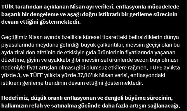 ANKARA, (DHA)-TİCARET Bakanı Ömer Bolat, "TÜİK tarafından açıklanan nisan ayı verileri, enflasyonla mücadelede başarılı bir dengeleme ve aşağı doğru istikrarlı bir gerileme sürecinin devam ettiğini göstermektedir" dedi