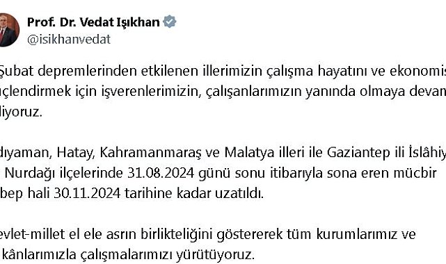 ANKARA, (DHA)- ÇALIŞMA ve Sosyal Güvenlik Bakanı Vedat Işıkhan, Adıyaman, Hatay, Kahramanmaraş ve Malatya ile Gaziantep'in İslahiye ve Nurdağı ilçelerinde 31 Ağustos 2024 tarihi itibarıyla sona eren mücbir sebep halinin 30 Kasım 2024 tarihine kadar uzatıldığını açıkladı