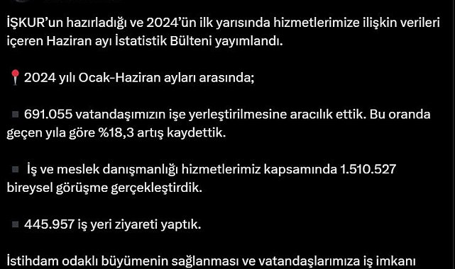 Gizem ÇORLU/ANKARA, (DHA)- ÇALIŞMA ve Soysal Güvenlik Bakanı Vedat Işıkhan, Türkiye İş Kurumu'nun (İŞKUR) Ocak-Haziran 2024 döneminde 691 bin 55 kişinin işe yerleşmesine aracılık ettiğini açıkladı
