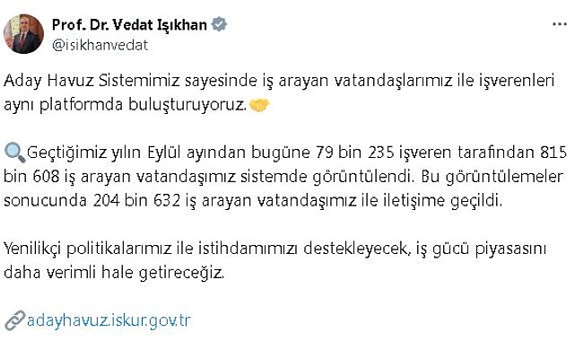 ANKARA, (DHA)- ÇALIŞMA ve Sosyal Güvenlik Bakanı Vedat Işıkhan, eylül ayından bugüne 815 bin 608 iş arayan vatandaşın 79 bin 235 işveren tarafından Aday Havuz Sistemi üzerinden görüntülendiğini açıkladı