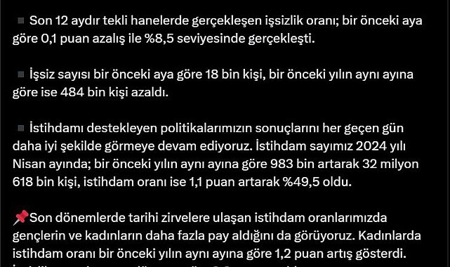 ÇALIŞMA ve Sosyal Güvenlik Bakanı Vedat Işıkhan, "Ekonomimiz istihdam üretmeye devam ediyor. İşsizlik oranımız son 11 yılın en düşük seviyesinde" dedi.Bakan Işıkhan, Türkiye İstatistik Kurumu'nun açıkladığı iş gücü istatistiklerine ilişkin sosyal medya hesabından yaptığı açıklamada, "Ekonomimiz istihdam üretmeye devam ediyor. İşsizlik oranımız son 11 yılın en düşük seviyesinde. Son 12 aydır tekli hanelerde gerçekleşen işsizlik oranı; bir önceki aya göre 0,1 puan azalış ile yüzde 8,5 seviyesinde gerçekleşti. İşsiz sayısı bir önceki aya göre 18 bin kişi, bir önceki yılın aynı ayına göre ise 484 bin kişi azaldı. İstihdamı destekleyen politikalarımızın sonuçlarını her geçen gün daha iyi şekilde görmeye devam ediyoruz. İstihdam sayımız 2024 yılı Nisan ayında; bir önceki yılın aynı ayına göre 983 bin artarak 32 milyon 618 bin kişi, istihdam oranı ise 1,1 puan artarak yüzde 49,5 oldu" ifadelerini kullandı.Son dönemlerde tarihi zirvelere ulaşan istihdam oranlarında gençler ve kadınların daha fazla pay aldığını aktaran Işıkhan, "Kadınlarda istihdam oranı bir önceki yılın aynı ayına göre 1,2 puan artış gösterdi. İşsizlik oranı ise aynı döneme göre 2,9 puan azaldı. OVP (Orta Vadeli Program) ve 12'nci Kalkınma Planımız doğrultusunda önümüzdeki dönemde de ekonomik istikrarı ve vatandaşlarımızın kalıcı refahını sağlayan politikalar ile istihdamı önceleyen adımlar atmaya devam edeceğiz" açıklamasında bulundu.