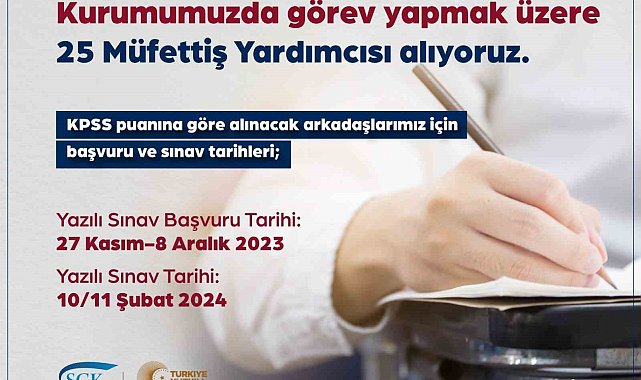 Çalışma ve Sosyal Güvenlik Bakanı Vedat Işıkhan, "KPSS puanı baz alınarak Sosyal Güvenlik Kurumumuza alınarak 25 Müfettiş Yardımcısı personel alımı gerçekleştiriyoruz" dedi.Çalışma ve Sosyal Güvenlik Bakanı Vedat Işıkhan, sosyal medya hesabından yaptığı paylaşımda Sosyal Güvenlik Kurumu'na KPSS puanı baz alınarak 25 personel alınacağını belirtti. Bakan Işıkhan şu ifadelere yer verdi:"Sosyal Güvenlik Kurumumuza, KPSS puanı baz alınarak 25 Müfettiş Yardımcısı personel alımı gerçekleştiriyoruz.Yazılı sınav başvuru tarihi, 27 Kasım-8 Aralık 2023Yazılı sınav tarihi, 10-11 Şubat 2024Çalışma ve Sosyal Güvenlik Bakanlığı ailemize katılacak yeni mesai arkadaşlarımıza şimdiden hayırlı olmasını diliyorum."