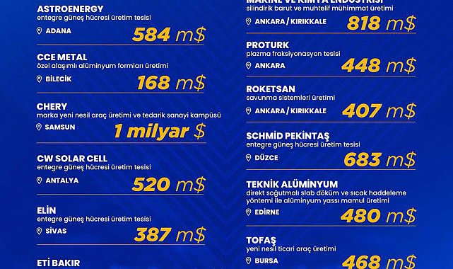 SANAYİ ve Teknoloji Bakanı Mehmet Fatih Kacır, "Edirne'den Samsun'a, Bilecik'ten Sivas'a 15 şehrimizde hayata geçecek büyük ölçekli sanayi yatırımları Türkiye'ye güç katacak" dedi.Bakan Kacır, 9,3 milyar dolarlık öngörülen yatırım tutarı ile 20 binden fazla istihdam ve yıllık cari dengeye 12 milyar dolarlık katkı sağlayacak olan büyük ölçekli sanayi yatırımlarının ayrıntılarını paylaştı. Cumhurbaşkanı Recep Tayyip Erdoğan tarafından açıklanan yatırımların ayrıntılarını sosyal medya hesabından paylaşan Bakan Kacır, "Edirne'den Samsun'a, Bilecik'ten Sivas'a 15 şehrimizde hayata geçecek büyük ölçekli sanayi yatırımları Türkiye'ye güç katacak. Güneş enerjisi teknolojilerinden yeni nesil araçlara, savunma sanayiinden sağlık teknolojilerine, ana metalden petrokimyaya Türkiye, yenilikçi teknolojilerde ve hammadde arz güvenliğinde yükselişini sürdürecek. 9,3 milyar dolar yatırımla, 20 binden fazla istihdam sağlanacak, cari dengemize yıllık 12 milyar dolar katkı sunulacak." ifadelerini kullandı.
