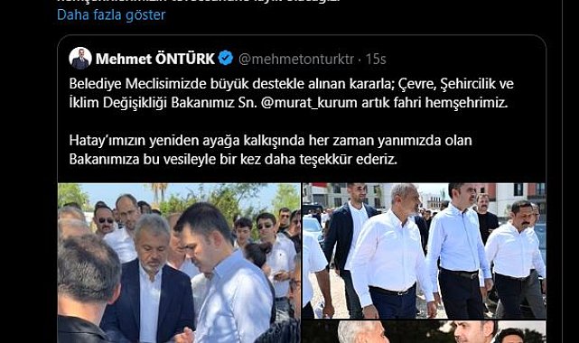 ÇEVRE, Şehircilik ve İklim Değişikliği Bakanı Murat Kurum, "Medeniyetlerin beşiği Hatay'ımızı eski güzel günlerine kavuşturacak, hemşehrilerimizin teveccühüne layık olacağız" dedi.Hatay Büyükşehir Belediye Meclisi'nde, AK Parti grubunun, Çevre, Şehircilik ve İklim Değişikliği Bakanı Murat Kurum'a fahri hemşehrilik beratı verilmesini içeren önergesi kabul edildi. Hatay Büyükşehir Belediye Başkanı Mehmet Öntürk, sosyal medya hesabından yaptığı paylaşımda, "Belediye Meclisimizde büyük destekle alınan kararla; Çevre, Şehircilik ve İklim Değişikliği Bakanımız Sayın Murat Kurum artık fahri hemşehrimiz. Hatay'ımızın yeniden ayağa kalkışında her zaman yanımızda olan bakanımıza bu vesileyle bir kez daha teşekkür ederiz" dedi.BAKAN KURUM'DAN TEŞEKKÜRBakan Kurum da sosyal medya hesabından paylaşım yaparak, Hataylılara teşekkür etti. Bakan Kurum mesajında, "Gönlümüz zaten Hataylıydı, hep Hatay'dan yanaydı. Hatay sevgimizi fahri hemşerilikle taçlandıran Hatay Büyükşehir Belediye Meclisi'ne şükranlarımı sunuyorum. Medeniyetlerin beşiği Hatay'ımızı eski güzel günlerine kavuşturacak, hemşehrilerimizin teveccühüne layık olacağız. Birliğimiz, kardeşliğimiz daim olsun" dedi. Depremin ardından ağır yıkıma uğrayan Hatay'daki çalışmalar kapsamında kentte bugüne kadar 40 bin 586 konut, 27 iş yeri ve 5 bin 554 köy evi olmak üzere toplam 46 bin 167 bağımsız bölüm teslim edildi. Yıl sonuna kadar 153 bin 248 konut ve iş yerinin teslim edileceği belirtildi. Bakan Kurum'a daha önce asrın felaketi sonrası yaptığı çalışmalardan dolayı Malatya Büyükşehir Belediyesi tarafından da fahri hemşehrilik beratı verilmişti.