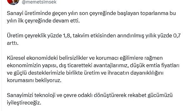 ANKARA, (DHA)- HAZİNE ve Maliye Bakanı Mehmet Şimşek, sanayi üretiminde geçen yılın son çeyreğinde başlayan toparlanmanın, bu yılın ilk çeyreğinde devam ettiğini açıkladı