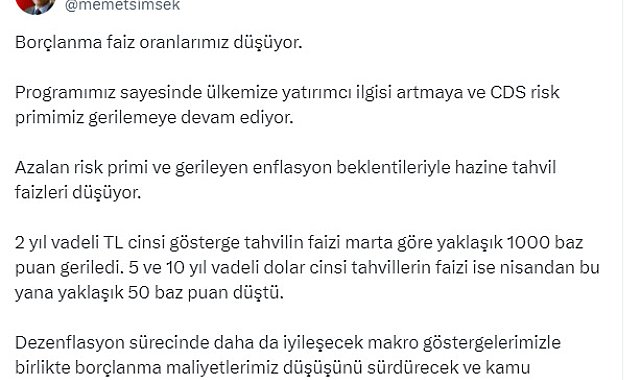 HAZİNE ve Maliye Bakanı Mehmet Şimşek, "Borçlanma faiz oranlarımız düşüyor. Programımız sayesinde ülkemize yatırımcı ilgisi artmaya ve kredi risk primimiz (CDS) gerilemeye devam ediyor" dedi.Bakan Şimşek, sosyal medya hesabından yaptığı açıklamada, "Borçlanma faiz oranlarımız düşüyor. Programımız sayesinde ülkemize yatırımcı ilgisi artmaya ve CDS risk primimiz gerilemeye devam ediyor. Azalan risk primi ve gerileyen enflasyon beklentileriyle hazine tahvil faizleri düşüyor. 2 yıl vadeli TL cinsi gösterge tahvilin faizi, marta göre yaklaşık bin baz puan geriledi. 5 ve 10 yıl vadeli dolar cinsi tahvillerin faizi ise nisandan bu yana yaklaşık 50 baz puan düştü. Dezenflasyon sürecinde daha da iyileşecek makro göstergelerimizle birlikte borçlanma maliyetlerimiz düşüşünü sürdürecek ve kamu maliyesindeki olumlu görünüm güçlenecektir" ifadelerini kullandı.