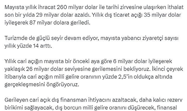 Aliekber METE/ANKARA, (DHA)- HAZİNE ve Maliye Bakanı Mehmet Şimşek, "Mayısta yıllık ihracat 260 milyar dolar ile tarihi zirvesine ulaşırken, ithalat son bir yılda 29 milyar dolar azaldı