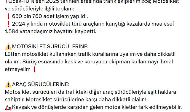İÇİŞLERİ Bakanı Ali Yerlikaya, 3-10 Nisan 2025 tarihleri arasında 3 milyon 652 bin 339 aracın denetlendiğini ve toplam 497 bin 591 araca/sürücüye işlem yapıldığını açıkladı.Bakan Yerlikaya, sosyal medyadan yaptığı açıklamada, emniyet ve jandarma trafik ekipleri tarafından 3-10 Nisan 2025 tarihleri arasında 3 milyon 652 bin 339 aracın denetlendiğini, ışıklı ya da sesli uyarı işareti bulunan cihazları (çakar) mevzuatta izin verilmeyen araçlara takarak kullanan 31 sürücüye işlem yapıldığını bildirdi. Yerlikaya, hız ihlalinde bulunan 166 bin 960, periyodik muayenesi yaptırılmamış 28 bin 697, emniyet kemeri kullanmayan 30 bin 290, sürücü belgesiz araç kullanan 13 bin 960 ve zorunlu mali sorumluluk sigortası bulunmayan 6 bin 971 olmak üzere diğer işlemlerle birlikte toplam 497 bin 591 araca/sürücüye işlem yapıldığını belirtti. 'MOTOSİKLET KAZALARINDA 1584 KİŞİ ÖLDÜ'Şehir içinde meydana gelen kazaların yüzde 52,3'üne, yani her iki kazadan birine motosiklet türü araçların karıştığını vurgulayan Bakan Yerlikaya, "1 Ocak-10 Nisan 2025 tarihleri arasında trafik ekiplerimizce; motosiklet ve sürücüleriyle ilgili toplam 650 bin 760 adet işlem yapıldı. 2024 yılında motosiklet türü araçların karıştığı kazalarda maalesef 1584 vatandaşımız hayatını kaybetti. Lütfen motosiklet kullanırken trafik kurallarına uyalım ve daha dikkatli olalım. Sürüş esnasında kask ve koruyucu ekipman kullanmayı ihmal etmeyelim. Motosiklet sürücüleri de trafikteki diğer araç sürücüleriyle eşit haklara sahiptir. Motosiklet sürücülerine karşı daha dikkatli olalım. Kavşak ve dönüşlerde karşıdan gelen motosikletler fark edilmeyebilir. Dönüş yapmadan önce motosikletlerin hızlarını ve mesafelerini dikkatle değerlendirelim. Ani manevralardan kaçınalım. Araç kapısını açmadan önce mutlaka yan aynadan gelen motosikletin olup olmadığını kontrol edelim. Motosiklet sürücülerine karşı yakın takip ve rahatsız edici davranışlardan kaçınalım. Yağmur, rüzgar, sis gibi olumsuz hava koşulları ve gece saatleri motosiklet sürücüleri için ciddi riskler oluşturur. Kötü havalarda ve hava kararınca motosiklet sürücülerine karşı daha dikkatli ve anlayışlı olalım. Yolculuklar sizleri sevdiklerinize kavuşturmak için vardır, ayırmak için değil" ifadelerini kullandı.