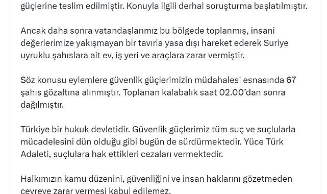 İÇİŞLERİ Bakanı Ali Yerlikaya, Kayseri'nin Melikgazi ilçesinde Suriye uyruklu bir kişinin 7 yaşındaki çocuğu taciz ettiği iddialarının ardından yaşanan olaylara ilişkin, "Konuyla ilgili derhal soruşturma başlatılmıştır. Ancak daha sonra vatandaşlarımız bu bölgede toplanmış, insani değerlerimize yakışmayan bir tavırla yasa dışı hareket ederek Suriye uyruklu şahıslara ait ev, iş yeri ve araçlara zarar vermiştir. Söz konusu eylemlere güvenlik güçlerimizin müdahalesi esnasında 67 şahıs gözaltına alınmıştır" dedi.Bakan Yerlikaya, dün akşam Kayseri'nin Melikgazi ilçesinde Suriye uyruklu bir kişinin 7 yaşındaki çocuğu taciz ettiği iddiasının ardından çıkan olaylar ile ilgili sosyal medya hesabından açıklama yaptı. Yerlikaya, "Dün akşam saatlerinde Kayseri, Melikgazi Eskişehir Bağları bölgesinde Suriye uyruklu I.A adlı şahıs, akrabası olan Suriyeli bir kız çocuğunu taciz etmesi üzerine, çevredeki vatandaşlar tarafından yakalanarak güvenlik güçlerine teslim edilmiştir. Konuyla ilgili derhal soruşturma başlatılmıştır. Ancak daha sonra vatandaşlarımız bu bölgede toplanmış, insani değerlerimize yakışmayan bir tavırla yasa dışı hareket ederek Suriye uyruklu şahıslara ait ev, iş yeri ve araçlara zarar vermiştir. Söz konusu eylemlere güvenlik güçlerimizin müdahalesi esnasında 67 şahıs gözaltına alınmıştır. Toplanan kalabalık saat 02.00'dan sonra dağılmıştır" dedi. 'YABANCI DÜŞMANLIĞINA MÜSAADE EDEMEYİZ'Yerlikaya, Türkiye'nin bir hukuk devleti olduğunu vurgulayarak, "Güvenlik güçlerimiz tüm suç ve suçlularla mücadelesini dün olduğu gibi bugün de sürdürmektedir. Yüce Türk Adaleti, suçlulara hak ettikleri cezaları vermektedir. Halkımızın kamu düzenini, güvenliğini ve insan haklarını gözetmeden çevreye zarar vermesi kabul edilemez. İnancımızda, medeniyet değerlerimizde, aziz milletimizin sicilinde olmayan yabancı düşmanlığına müsaade edemeyiz" açıklamasında bulundu.
