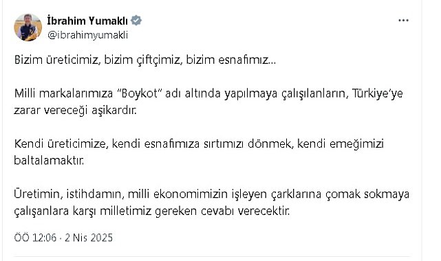 TARIM ve Orman Bakanı İbrahim Yumaklı, "Milli markalarımıza 'Boykot' adı altında yapılmaya çalışılanların, Türkiye'ye zarar vereceği aşikardır" dedi.Tarım ve Orman Bakanı İbrahim Yumaklı, sosyal medya hesabından yaptığı açıklamada, "Bizim üreticimiz, bizim çiftçimiz, bizim esnafımız. Milli markalarımıza 'Boykot' adı altında yapılmaya çalışılanların, Türkiye'ye zarar vereceği aşikardır. Kendi üreticimize, kendi esnafımıza sırtımızı dönmek, kendi emeğimizi baltalamaktır. Üretimin, istihdamın, milli ekonomimizin işleyen çarklarına çomak sokmaya çalışanlara karşı milletimiz gereken cevabı verecektir" ifadelerini kullandı.