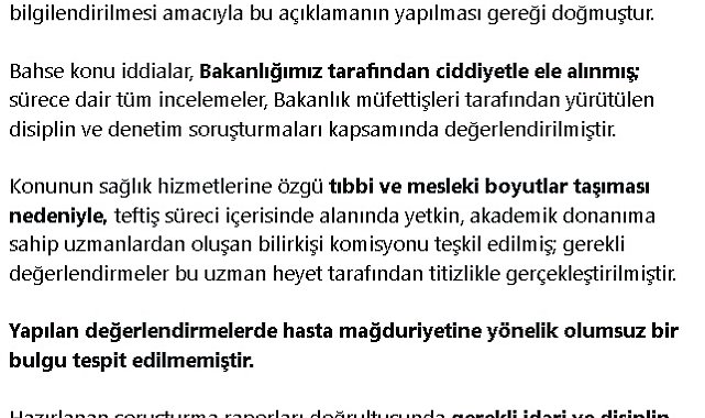 SAĞLIK Bakanlığı, Muğla Eğitim ve Araştırma Hastanesi Nükleer Tıp Biriminde yaşandığı iddia edilen uygulamalara ilişkin sosyal medya hesabından açıklama yaptı.Bakanlığın, 'Sağlık Bakanlığı Sağlıklı Çözüm' adlı sosyal medya hesabından yapılan paylaşımda, "Son günlerde bazı haber mecralarında yer alan, Muğla Eğitim ve Araştırma Hastanesi Nükleer Tıp Biriminde yaşandığı iddia edilen uygulamalara ilişkin haberler üzerine kamuoyunun doğru bilgilendirilmesi amacıyla bu açıklamanın yapılması gereği doğmuştur. Bahse konu iddialar, Bakanlığımız tarafından ciddiyetle ele alınmış; sürece dair tüm incelemeler, Bakanlık müfettişleri tarafından yürütülen disiplin ve denetim soruşturmaları kapsamında değerlendirilmiştir. Konunun sağlık hizmetlerine özgü tıbbi ve mesleki boyutlar taşıması nedeniyle, teftiş süreci içerisinde alanında yetkin, akademik donanıma sahip uzmanlardan oluşan bilirkişi komisyonu teşkil edilmiş; gerekli değerlendirmeler bu uzman heyet tarafından titizlikle gerçekleştirilmiştir. Yapılan değerlendirmelerde hasta mağduriyetine yönelik olumsuz bir bulgu tespit edilmemiştir. Hazırlanan soruşturma raporları doğrultusunda gerekli idari ve disiplin işlemleri gecikmeksizin başlatılmış ve uygulanmıştır. Hasta güvenliğini en üst düzeyde tutmak, sağlık hizmetlerimizin temel önceliğidir. Sürece dair gelişmeler kamuoyu ile paylaşılmaya devam edilecektir" ifadelerine yer verildi.