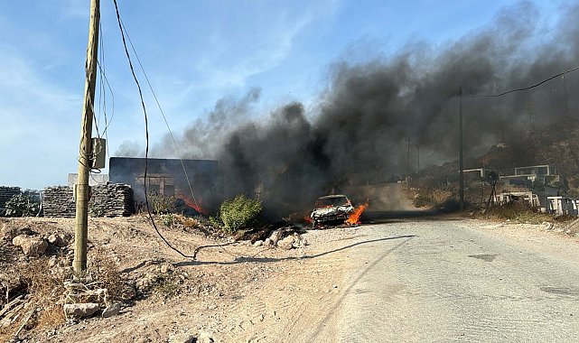 Fırat AKAY/ BODRUM (Muğla), (DHA)- MUĞLA'nın Bodrum ilçesinde, atıkların toplandığı şantiye alanında çıkıp ardından park halindeki bir otomobil ve depoya sıçrayan yangında gökyüzünü siyah duman kapladı