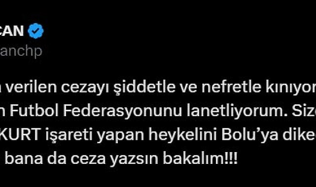 Murat KÜÇÜK/ BOLU,(DHA)- BOLU Belediye Başkanı Tanju Özcan, Merih Demiral'ın UEFA tarafından 2 maç men cezası almasına tepki göstererek, "Size söz Merih Demiral'ın bozkurt işareti yapan heykelini Bolu'ya dikeceğim! Haydi bakalım Avrupa bana da ceza yazsın bakalım" dedi