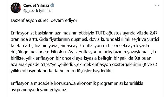 CUMHURBAŞKANI Yardımcısı Cevdet Yılmaz, "Dezenflasyon süreci devam ediyor. Enflasyonist baskıların azalmasının etkisiyle TÜFE (Tüketici fiyat endeksi) ağustos ayında yüzde 2,47 oranında arttı. Gıda fiyatlarının düşmesi, döviz kurundaki ılımlı seyir ve yurt içi talebin artış hızının yavaşlaması aylık enflasyonun bir önceki aya kıyasla düşük gelmesinde etkili oldu" dedi.Cumhurbaşkanı Yardımcısı Cevdet Yılmaz, enflasyon verilerine ilişkin sosyal medya hesabından yaptığı açıklamada, "Dezenflasyon süreci devam ediyor. Enflasyonist baskıların azalmasının etkisiyle TÜFE ağustos ayında yüzde 2,47 oranında arttı. Gıda fiyatlarının düşmesi, döviz kurundaki ılımlı seyir ve yurt içi talebin artış hızının yavaşlaması aylık enflasyonun bir önceki aya kıyasla düşük gelmesinde etkili oldu. Aylık enflasyonun artış hızının yavaşlamasıyla birlikte, yıllık enflasyon bir önceki aya kıyasla belirgin bir şekilde 9,8 puan azalarak yüzde 51,97'ye geriledi. Çekirdek enflasyon göstergelerinin (B ve C) yıllık enflasyonlarında da belirgin düşüşler kaydedildi" ifadelerini kullandı.'ETKİLERİNİ GÖRMEYE BAŞLAYACAĞIZ'Enflasyonla mücadele konusunda mevcut ekonomik programı kararlılıkla uygulamaya devam ettiklerini kaydeden Yılmaz, "Güçlü siyasi ve sosyal sahiplenme ile enflasyonda sağladığımız sonuçlarla öngörülebilirliği arttırıyor, istikrar içinde büyüme hedefimize katkıda bulunuyoruz. Enflasyon konusunda elde ettiğimiz pozitif sonuçların refah seviyesi ve gelir dağılımı üzerindeki etkilerini de önümüzdeki dönemde görmeye başlayacağız. Açıklayacağımız güncellenmiş OVP (Orta Vadeli Program) ile mal ve hizmet piyasalarının daha etkin işlev görmesini sağlayacak ve piyasada rekabeti artıracak politikalar vasıtasıyla enflasyon üzerindeki ataleti kırmayı ve uzun dönemli beklentileri iyileştirerek dezenflasyonun reel ekonomi üzerindeki maliyetini hafifletmeyi amaçlıyoruz" açıklamasında bulundu.