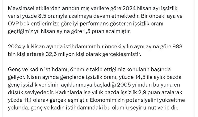 CUMHURBAŞKANI Yardımcısı Cevdet Yılmaz, "Nisan ayında gençlerde işsizlik oranı, yüzde 14,5 ile aylık bazda genç işsizlik verisinin açıklanmaya başladığı 2005 yılından bu yana en düşük seviyededir. Kadınlarda ise yıllık bazda işsizlik 2,9 puan azalarak yüzde 11,1 olarak gerçekleşmiştir. Ekonomimizin potansiyelini yükseltme yolunda, genç ve kadın istihdamındaki bu olumlu seyir umut vericidir" dedi.Cumhurbaşkanı Yardımcısı Cevdet Yılmaz, sosyal medya hesabından yaptığı açıklamada, Türkiye İstatistik Kurumu'nun yayımladığı nisan ayı iş gücü istatistiklerine ilişkin değerlendirmede bulundu. Yılmaz, "Kararlılıkla uyguladığımız programımızın olumlu sonuçlarını görmeye devam ediyoruz. Mevsimsel etkilerden arındırılmış verilere göre 2024 Nisan ayı işsizlik verisi yüzde 8,5 oranıyla azalmaya devam etmektedir. Bir önceki aya ve Orta Vadeli Program (OVP) beklentilerimize göre iyi performans gösteren işsizlik oranı geçtiğimiz yıl nisan ayına göre 1,5 puan azalmıştır. 2024 yılı nisan ayında istihdamımız bir önceki yılın aynı ayına göre 983 bin kişi artarak 32,6 milyon kişi olarak gerçekleşmiştir" ifadelerini kullandı.'VATANDAŞLARIMIZIN REFAHINI ARTIRMAYA DEVAM EDECEĞİZ'Genç ve kadın istihdamının, önemle takip ettikleri konuların başında geldiğini vurgulayan Yılmaz, "Nisan ayında gençlerde işsizlik oranı, yüzde 14,5 ile aylık bazda genç işsizlik verisinin açıklanmaya başladığı 2005 yılından bu yana en düşük seviyededir. Kadınlarda ise yıllık bazda işsizlik 2,9 puan azalarak yüzde 11,1 olarak gerçekleşmiştir. Ekonomimizin potansiyelini yükseltme yolunda, genç ve kadın istihdamındaki bu olumlu seyir umut vericidir. Girmiş olduğumuz dezenflasyon döneminde ilerlerken, sürdürülebilir ve kaliteli büyümeyle iş gücü potansiyelini harekete geçirmeye, yeni istihdam imkanları oluşturmaya ve vatandaşlarımızın uzun vadeli refahını artırmaya devam edeceğiz" dedi.