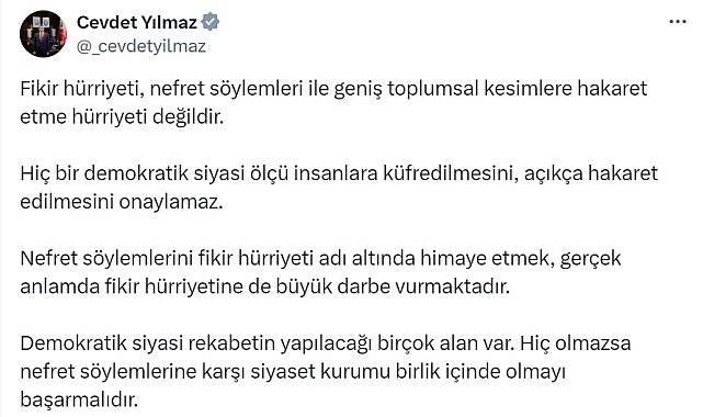 CUMHURBAŞKANI Yardımcısı Cevdet Yılmaz, "Fikir hürriyeti, nefret söylemleri ile geniş toplumsal kesimlere hakaret etme hürriyeti değildir. Hiçbir demokratik siyasi ölçü insanlara küfredilmesini, açıkça hakaret edilmesini onaylamaz" dedi.Cevdet Yılmaz, sosyal medya hesabından İzmir'de sokak röportajındaki sözleri nedeniyle tutuklanan Dilruba Kayserilioğlu'nun, tahliyesinin ardından CHP Genel Başkanı Özgür Özel tarafından protokolde ağırlanmasıyla ilgili, açıklama yaptı. Yılmaz, duruma tepki göstererek şunları kaydetti:"Fikir hürriyeti, nefret söylemleri ile geniş toplumsal kesimlere hakaret etme hürriyeti değildir. Hiçbir demokratik siyasi ölçü insanlara küfredilmesini, açıkça hakaret edilmesini onaylamaz. Nefret söylemlerini fikir hürriyeti adı altında himaye etmek, gerçek anlamda fikir hürriyetine de büyük darbe vurmaktadır. Demokratik siyasi rekabetin yapılacağı birçok alan var. Hiç olmazsa nefret söylemlerine karşı siyaset kurumu birlik içinde olmayı başarmalıdır."
