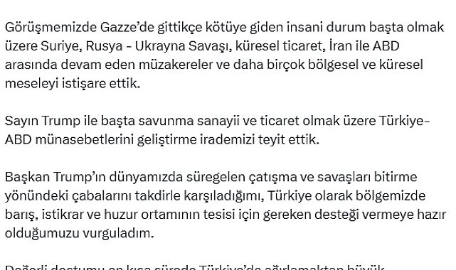 CUMHURBAŞKANI ERDOĞAN'DAN GÖRÜŞMEYE İLİŞKİN PAYLAŞIMCumhurbaşkanı Recep Tayyip Erdoğan, ABD Başkanı Donald Trump ile yaptığı telefon görüşmesine ilişkin sosyal medya hesabından paylaşım yaptı