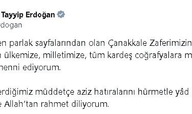 ANKARA, (DHA)- CUMHURBAŞKANI Recep Tayyip Erdoğan, "Çanakkale Zaferimizin 110'uncu yıl dönümünün ülkemize, milletimize, tüm kardeş coğrafyalara mübarek olmasını temenni ediyorum" dedi