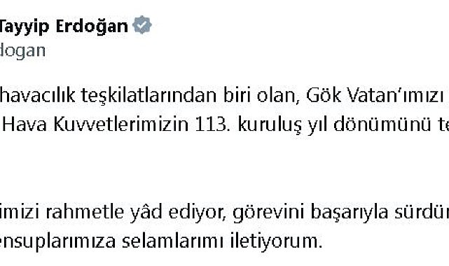 ANKARA, (DHA)- CUMHURBAŞKANI Recep Tayyip Erdoğan, Hava Kuvvetleri Komutanlığı'nın 113'üncü kuruluş yıl dönümünü tebrik etti
