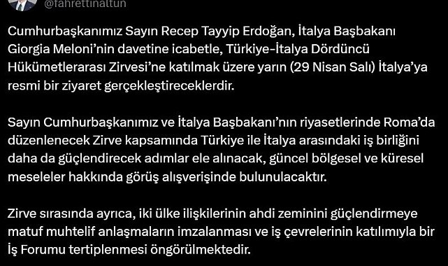 İLETİŞİM Başkanı Fahrettin Altun, Cumhurbaşkanı Recep Tayyip Erdoğan'ın, 'Türkiye-İtalya Dördüncü Hükümetlerarası Zirvesi'ne katılmak üzere yarın İtalya'ya resmi bir ziyaret gerçekleştireceğini duyurdu.İletişim Başkanı Fahrettin Altun, sosyal medya hesabından yaptığı açıklamada, "Cumhurbaşkanımız Sayın Recep Tayyip Erdoğan, İtalya Başbakanı Giorgia Meloni'nin davetine icabetle, Türkiye-İtalya Dördüncü Hükümetlerarası Zirvesi'ne katılmak üzere yarın (29 Nisan Salı) İtalya'ya resmi bir ziyaret gerçekleştireceklerdir. Sayın Cumhurbaşkanımız ve İtalya Başbakanı'nın riyasetlerinde Roma'da düzenlenecek Zirve kapsamında Türkiye ile İtalya arasındaki iş birliğini daha da güçlendirecek adımlar ele alınacak, güncel bölgesel ve küresel meseleler hakkında görüş alışverişinde bulunulacaktır. Zirve sırasında ayrıca, iki ülke ilişkilerinin ahdi zeminini güçlendirmeye matuf muhtelif anlaşmaların imzalanması ve iş çevrelerinin katılımıyla bir İş Forumu tertiplenmesi öngörülmektedir" dedi.