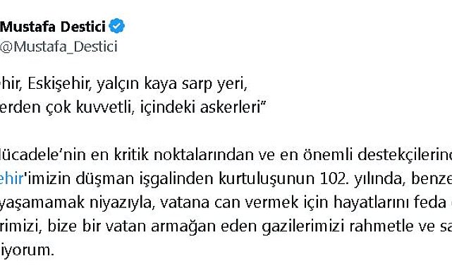 BÜYÜK Birlik Partisi (BBP) Genel Başkanı Mustafa Destici, Eskişehir'in 2 Eylül 1922'de Yunan işgalinden kurtuluşunun 102'nci yıl dönümünü kutladı.BBP Genel Başkanı Destici, sosyal medya hesabından yaptığı açıklamada, "'Eskişehir, Eskişehir; yalçın kaya sarp yeri/Kalelelerden çok kuvvetli, içindeki askerleri.' Milli Mücadele'nin en kritik noktalarından ve en önemli destekçilerinden Eskişehirimizin düşman işgalinden kurtuluşunun 102'nci yılında, benzer acıları tekrar yaşamamak niyazıyla, vatana can vermek için hayatlarını feda eden şehitlerimizi, bize bir vatan armağan eden gazilerimizi rahmetle ve saygıyla yad ediyorum" ifadelerini kullandı.