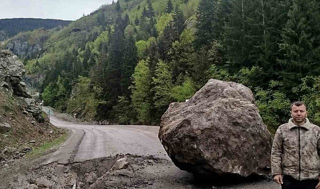 GÜMÜŞHANE'de meydana gelen heyelanda yamaçtan kopan dev kaya parçası, Erikbeli Yaylası'na ulaşım sağlanan yola düştü. Ekipler iş makinesiyle kayayı kaldırarak kapanan yolu ulaşıma açarken, yaylaya gitmek üzere yola çıkan arkadaş grubu da dev kaya parçasının altında kalmaktan son anda kurtuldu. Grup, olay sonrasını cep telefonu kamerasıyla kaydetti. Kürtün ilçesine bağlı Erikbeli Yaylası Kale Mahallesi mevkisinde sabah saatlerinde meydana gelen heyelanla dağ yamacından kopan toprak ve büyük kaya kütlesi karayoluna düştü. Yaylaya gitmek için otomobille yola çıkan arkadaş grubu, dev kaya kütlesinin altında kalmaktan son anda kurtuldu. Grupta yer alanlar, kaya düşmesi sonrası yolda yaşadıkları korku dolu anları cep telefonu kamerasıyla kayda alıp, görüntüleri sosyal medya hesaplarından paylaştı.Bölgede önlem alarak çalışma başlatan Karayolları ekipleri, iş makinesiyle kaya kütlesini kaldırarak, kapanan yolu ulaşıma açtı.