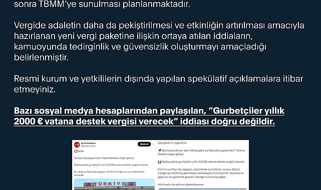 İLETİŞİM Başkanlığı Dezenformasyonla Mücadele Merkezi (DMM) "Hazine ve Maliye Bakanlığı tarafından hazırlanma aşamasında olan yeni vergi paketinde yurt dışında yaşayan vatandaşlarımıza herhangi bir başlık altında vergilendirme çalışması söz konusu değildir" açıklamasını yaptı.DMM'nin sosyal medya hesabından yapılan açıklamada, "Bazı sosyal medya hesaplarından paylaşılan, 'Gurbetçiler yıllık 2 bin Euro vatana destek vergisi verecek' iddiası doğru değildir. Hazine ve Maliye Bakanlığı tarafından hazırlanma aşamasında olan yeni vergi paketinde yurt dışında yaşayan vatandaşlarımıza herhangi bir başlık altında vergilendirme çalışması söz konusu değildir. Bahse konu yeni vergi paketine ilişkin piyasadaki paydaşlar tarafından Hazine ve Maliye Bakanlığı'na sunulan öneri ve beklentiler değerlendirilmekte olup, bakanlık tarafından son haline getirildikten sonra TBMM'ye sunulması planlanmaktadır. Vergide adaletin daha da pekiştirilmesi ve etkinliğin artırılması amacıyla hazırlanan yeni vergi paketine ilişkin ortaya atılan iddiaların, kamuoyunda tedirginlik ve güvensizlik oluşturmayı amaçladığı belirlenmiştir. Resmi kurum ve yetkililerin dışında yapılan spekülatif açıklamalara itibar etmeyiniz" denildi.
