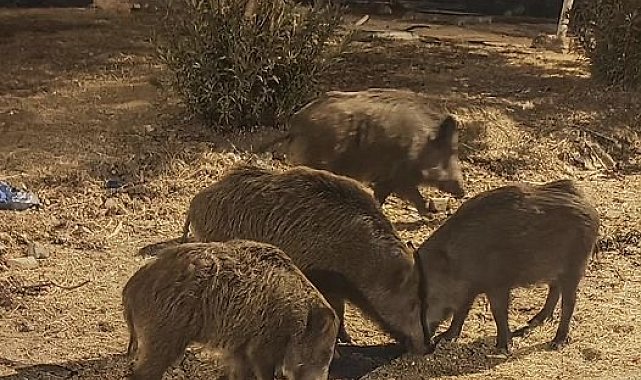AYDIN'ın Didim ilçesinde ormanda yiyecek bulamayan ve aç kalan yaban domuzları, şehre indi. O anlar, cep telefonu kamerasıyla kaydedildi.Didim ilçesi Akbük Mahallesi'nde, akşam saatlerinde ormandan yerleşim inen aç yaban domuzları, sürüler halinde yavruları ile birlikte yollarda ve evlerin bahçelerinde yiyecek aradı. Çevredekiler, yaban domuzlarının yiyecek aradığı o anları cep telefonu kamerasıyla kaydetti.