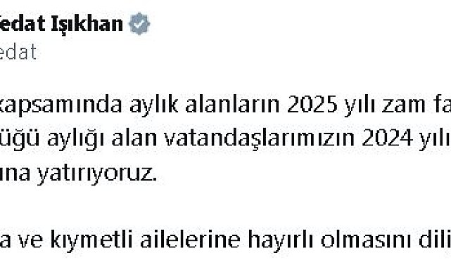 ANKARA, (DHA)- ÇALIŞMA ve Sosyal Güvenlik Bakanı Vedat Işıkhan, Emekli Sandığı 2025 yılı zam farkları ile Harp ve Vazife Malullüğü Aylığı 2024 yılı ek ödemelerinin bugün yatırılacağını açıkladı