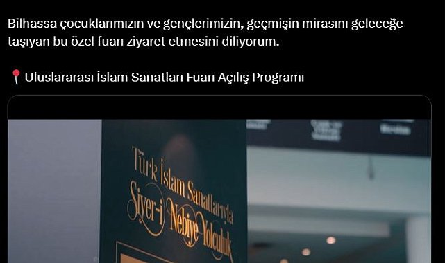 ANKARA, (DHA)- CUMHURBAŞKANI Recep Tayyip Erdoğan'ın eşi Emine Erdoğan, ATO Congresium'da açılan 'Uluslararası İslam Sanatları Fuarı'na ilişkin paylaşım yaptı