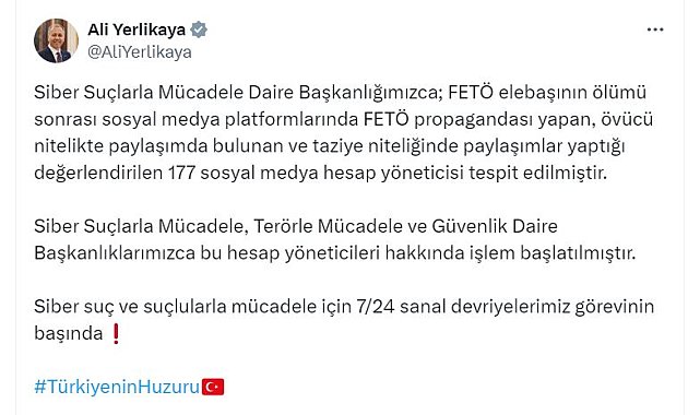 İÇİŞLERİ Bakanı Ali Yerlikaya, FETÖ elebaşının ölümü sonrası sosyal medya platformlarında FETÖ propagandası yapan 177 kişi hakkında işlem başlatıldığını duyurdu.Bakan Yerlikaya, sosyal medya hesabından yaptığı açıklamada, "Siber Suçlarla Mücadele Daire Başkanlığımızca; FETÖ elebaşının ölümü sonrası sosyal medya platformlarında FETÖ propagandası yapan, övücü nitelikte paylaşımda bulunan ve taziye niteliğinde paylaşımlar yaptığı değerlendirilen 177 sosyal medya hesap yöneticisi tespit edilmiştir. Siber Suçlarla Mücadele, Terörle Mücadele ve Güvenlik Daire Başkanlıklarımızca bu hesap yöneticileri hakkında işlem başlatılmıştır. Siber suç ve suçlularla mücadele için 7/24 sanal devriyelerimiz görevinin başında" dedi.