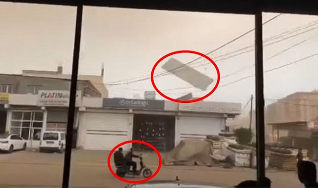 MARDİN'in Kızıltepe ilçesinde etkili olan fırtınada bir iş yerinin çatısından uçan sac levha, elektrik tellerine çarpıp yön değiştirdi. Bu sırada yoldan geçen motosikletteki 2 kişi ölümden döndü.Meteoroloji 15'inci Bölge Müdürlüğü'nün uyarılarının ardından dün akşam saatlerinde Mardin'de de fırtına etkili oldu. Kızıltepe ilçesindeki fırtınada bazı ev ve iş yerlerinin çatıları uçtu, elektrik direkleri ve ağaçlar devrildi. Dün akşam saatlerinde Sanayi Mahallesi'nde bir iş yerinin damında bulunan çatı malzemeleri de kuvvetli rüzgarla birlikte sokağa savruldu. Bir sac levha, sokaktan geçen ve üzerinde 2 kişi bulunan motosiklete doğru yöneldi. Elektrik tellerine çarpan levha yön değiştirirken, olayı cep telefonu ile görüntüleyen kişi o an panik yaşayarak motosikletlilere seslendi. O anlar saniye saniye kaydedilirken, olayda yaralanan olmadı.