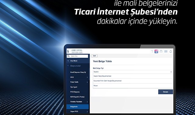 İş Bankası, ticari müşterilerinin periyodik olarak şubelere ilettikleri geçici vergi beyannamesi, kurumlar vergisi beyannamesi ve mizan belgelerinin Ticari İnternet Şubesi üzerinden banka sistemine yüklenmesine imkân veren yeniliği hizmete sundu.Bu yenilik ile İş Bankası'nın ticari müşterileri ilgili belgelerini işlerinin başından ayrılmadan, dakikalar içerisinde Ticari İnternet Şubesi'ndeki Belgelerim menüsünden 'Yeni Belge Yükleme' ekranı üzerinden sisteme yükleyebilecek. Böylelikle ticari müşteriler, işlemlerini daha kolay ve hızlı yapma olanağı elde edip zamandan tasarruf edebilecek.
