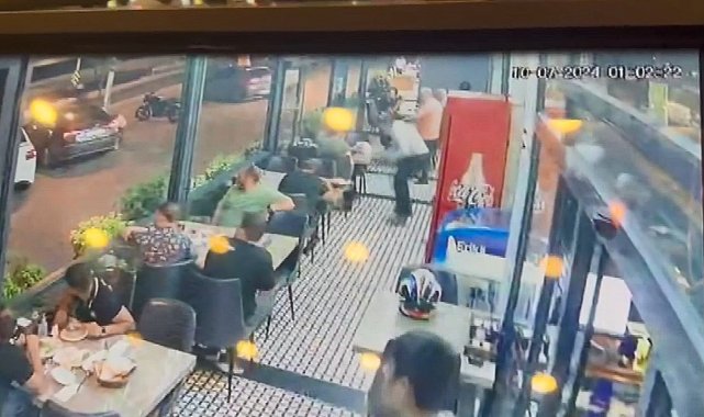 - ESENYURT'ta yüzleri maskeli motosikletli 2 şüpheli, müşterilerin yemek yediği sırada restorana ateş açtı. Kurşunlardan birinin restorandaki müşteriyi teğet geçtiği saldırıda, ölen ya da yaralanan olmadı. Saldırı anı iş yerinin güvenlik kamerasına saniye saniye yansıdı. Olay, gece saat 01.15 sıralarında Zafer Mahallesi'nde meydana geldi. Edinilen bilgiye göre, henüz plakası belirlenemeyen yüzleri maskeli motosikletli 2 şüpheli, müşterilerin yemnek yediği sırada restorana ateş açtı.Müşteriler ve iş yeri çalışanları panikle eğilirken şüpheliler motosikletle olay yerinden kaçtı. Kurşunun bir müşteriyi teğet geçtiği saldırıda, ölen ya da yaralanan olmadı.İhbar üzerine olay yerine polis ekipleri sevk edildi. Polis ekipleri çevredeki güvenlik kameralarını incelerken, restoranın camına 1 kurşun isabet ettiği belirlendi. O ANLAR KAMERADA Yaşanan olay iş yerinin güvenlik kamerasına saniye saniye yansıdı. Görüntülerde müşterilerin yemek yediği sırada, yüzleri maskeli motosikletli 2 şüphelinin restorana ateş açtığı anlar görülüyor. Bu sırada restorandaki müşterilerden bazıları kurşunlardan korunmak için yere eğiliyor. Silahlı saldırının ardından 2 şüphelinin olay yerinden uzaklaştığı anlar da görüntülerde yer alıyor. Görüntü Dökümü:--------------------------(Güvenlik kamerası) Saldırı anı Müşterilerin yere eğildiği anlar