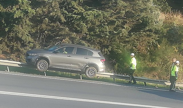 İSTANBUL, (DHA) TEM Otoyolu Bahçeşehir - Edirne istikametinde sabah saatlerinde meydana gelen kazada otomobil bariyer üzerinde asılı kalmış görüldü
