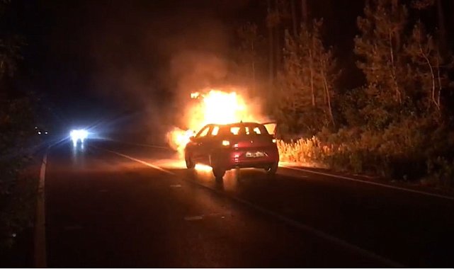 SARIYER'de seyir halindeki otomobil henüz bilinmeyen bir nedenle alev alev yandı. İtfaiye ekiplerinin müdahalesiyle söndürülen yangını, çevredekiler cep telefonu kamerasıyla görüntüledi. Olay, dün saat 20.00 sıralarında Garipçe Yolu'nda meydana geldi. Edinilen bilgiye göre seyir halinde olan bir otomobilin motor bölümünü henüz bilinmeyen bir nedenle yanmaya başladı. Alevlerin kısa sürede otomobili sarması üzerine çevredeki sürücüler itfaiye ekiplerine haber verdi. Kısa sürede olay yerine gelen ekipler, alev alev yanan otomobile müdahale etti. Müdahale sonrası yangın kontrol altına alınırken, araç kullanılamaz hale geldi. Araçtaki 4 kişinin yangın başlangıcında aşağıya indiği öğrenildi. Yangınla ilgili inceleme başlatıldı.