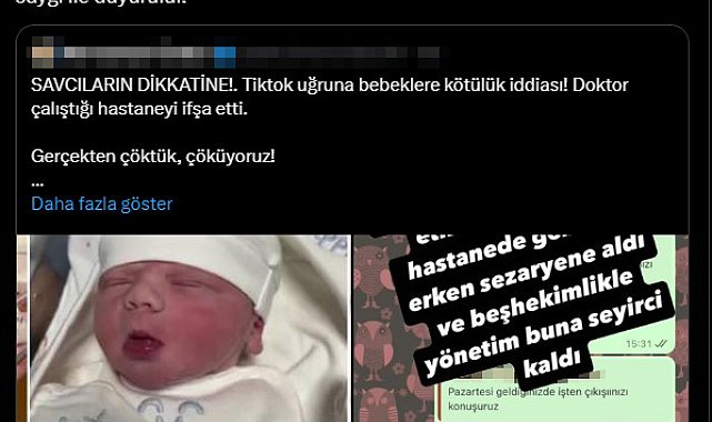 - İSTANBUL'daki bir özel hastanede çalışan doktor, sosyal medya hesabıdan anne adaylarının sosyal medyaya video çekmek amacıyla erken doğum yaptırıldığı iddiasında bulundu. Sağlık Bakanlığı'nın 'Sağlıklı Çözüm' isimli sosyal medya hesabından İstanbul İl Sağlık Müdürlüğü, iddialar hakkında inceleme başlattığı duyuruldu.İstanbul'da özel bir hastanede çalışan doktor E.E., kendi sosyal medya hesabından çalıştığı hastanede yeni doğan bebeklere kötü muamelede bulunulduğunu iddia eden paylaşımlarda bulundu. Sosyal medyaya video çekilmesi amacıyla anne adaylarının erken doğuma alındığı ve sezaryen yoluyla doğum yaptırıldığı şeklinde iddialarda bulunan doktor, buna karşı çıktığı için tehdit edildiğini belirtti. Sosyal medyada iddiaların yayılmasının ardından Sağlık Bakanlığı'na bağlı 'Sağlıklı Çözüm' hesabından İstanbul İl Sağlık Müdürlüğü'nün iddialar hakkında inceleme başlattığı duyuruldu.
