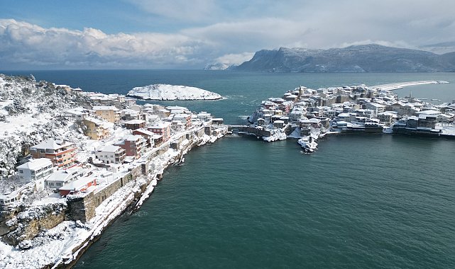 BARTIN'ın tarihi ve turistik ilçesi Amasra, 3 gün devam eden kar yağışıyla beyaza büründü. İlçedeki kar kalınlığı 50 santime ulaşırken, oluşan seyirlik manzara dronla havadan görüntülendi.Amasra ilçesinde sabah saatlerinde kar yağışı etkili olurken kent beyaz örtüyle kaplandı. Kar kalınlığı 50 santimetreye ulaştı. Soğuk hava nedeniyle sokakların boş kaldığı ilçede belediye ekipleri kar temizleme çalışması yaparak yolları açık tuttu. Kentteki balıkçılar kötü hava koşulları nedeniyle denize açılamazken, ilçeye gelen az sayıdaki misafir de Amasra Kalesi'ni gezerek hatıra fotoğrafı çekti. Tarihi Amasra kalesi, Kemere Köprüsü ve Tavşan Adası beyaza büründü. Güneşin açmasıyla ilçede bulunanlar bol bol fotoğraf çekip, güzel manzaranın keyfini çıkardı. UNESCO geçici miras listesinde bulunan kar ile beyaza bürünen Amasra'nın seyirlik manzarası dronla havadan görüntülendi.