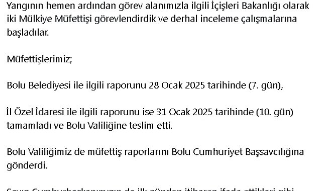 Salih HÜDAVERDİ/ ANKARA, (DHA)- İÇİŞLERİ Bakanı Ali Yerlikaya, Bolu Kartalkaya'daki otel yangınıyla ilgili iki bakanlık müfettişi tarafından Bolu Belediyesi ve İl Özel İdaresi'yle ilgili hazırlanan raporların Bolu Cumhuriyet Başsavcılığı'na teslim edildiğini bildirdi
