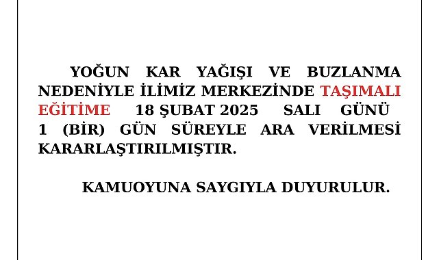 KASTAMONU İl Milli Eğitim Müdürlüğü, yoğun kar yağışı nedeniyle taşımalı eğitime 1 gün ara verildiğini duyurdu. Kastamonu İl Milli Eğitim Müdürlüğü, sosyal medya hesabından yapılan paylaşımda, "Yoğun kar yağışı ve buzlanma nedeniyle ilimiz merkezinde taşımalı eğitime 18 Şubat 2025 salı günü 1 (bir) gün süreyle ara verilmesi kararlaştırılmıştır" ifadeleri kullanıldı.