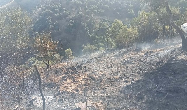 Burhan CEYHAN/ AYDIN, (DHA)- AYDIN'ın Efeler ilçesinde, bir çiftlikteki çatı inşaatında kaynaktan sıçrayan kıvılcımlar nedeniyle zeytinlikte yangın çıktı