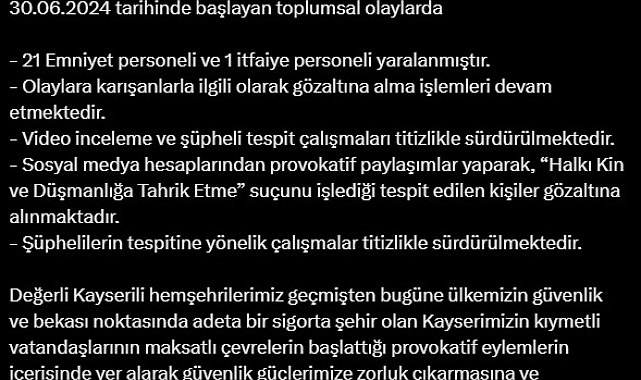 KAYSERİ Valisi Gökmen Çiçek, Suriye uyruklu 7 yaşındaki kız çocuğunun akrabası tarafından taciz edilmesinin ardından kentte yaşanan olaylarda 21 emniyet personeli ile 1 itfaiye erinin yaralandığını açıkladı.Vali Gökmen Çiçek, Suriye uyruklu 7 yaşındaki kız çocuğunun akrabası tarafından taciz edilmesinin ardından kentte yaşanan olaylarla ilgili sosyal medya hesabından açıklama yaptı. Vali Çiçek, paylaşımda, "30 Haziran 2024 tarihinde başlayan toplumsal olaylarda 21 emniyet personeli ve 1 itfaiye personeli yaralanmıştır. Olaylara karışanlarla ilgili olarak gözaltına alma işlemleri devam etmektedir. Video inceleme ve şüpheli tespit çalışmaları titizlikle sürdürülmektedir. Sosyal medya hesaplarından provokatif paylaşımlar yaparak, 'halkı kin ve düşmanlığa tahrik etme' suçunu işlediği tespit edilen kişiler gözaltına alınmaktadır. Şüphelilerin tespitine yönelik çalışmalar titizlikle sürdürülmektedir. Değerli Kayserili hemşehrilerimiz geçmişten bugüne ülkemizin güvenlik ve bekası noktasında adeta bir sigorta şehir olan Kayserimizin kıymetli vatandaşlarının maksatlı çevrelerin başlattığı provokatif eylemlerin içerisinde yer alarak güvenlik güçlerimize zorluk çıkarmasına ve hemşehrilerimizin huzurunu bozmalarına izin vermeyeceğiz. Vatandaşlarımızın itidalli davranarak hiçbir menfur eylemin içinde bulunmamalarını önemle rica ederiz" ifadelerine yer verdi.